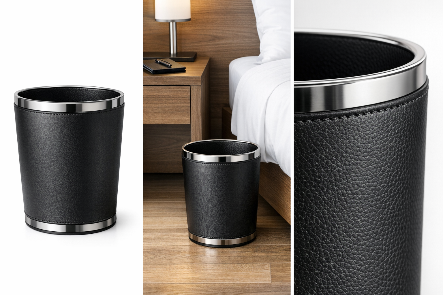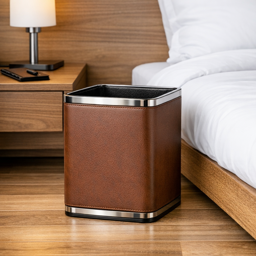 This premium leather waste bin is designed to enhance the presentation and functionality of hotel rooms, suites, and professional spaces. Its refined leather exterior adds a luxurious touch, while the durable internal structure ensures long‑lasting performance. The easy‑clean surface makes it ideal for daily hotel operations, maintaining both hygiene and aesthetics. With customizable colors, sizes, and branding options, this waste bin can be tailored to match your interior design and brand identity.