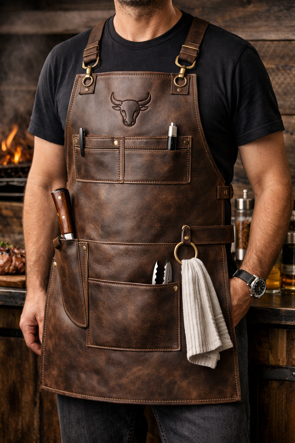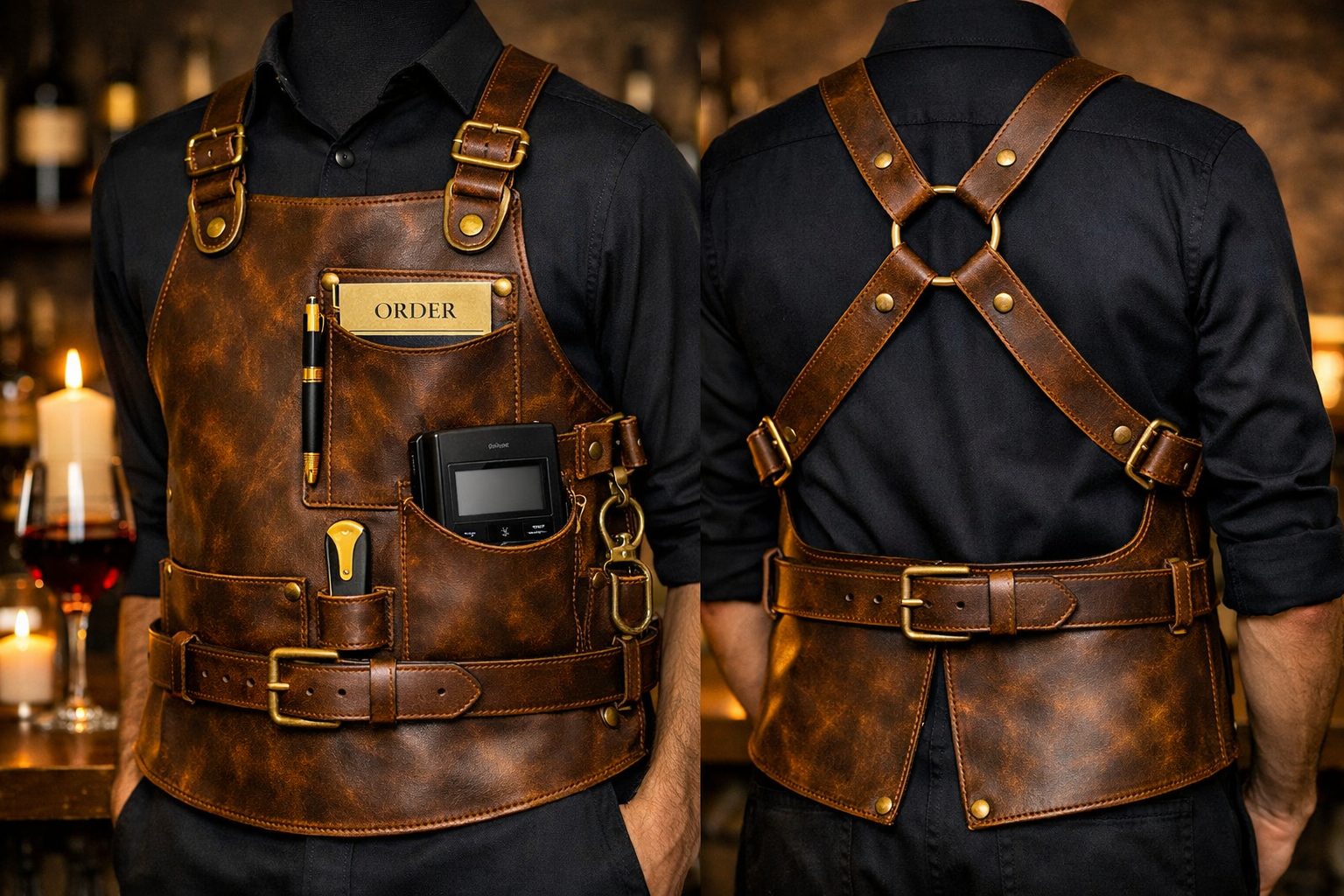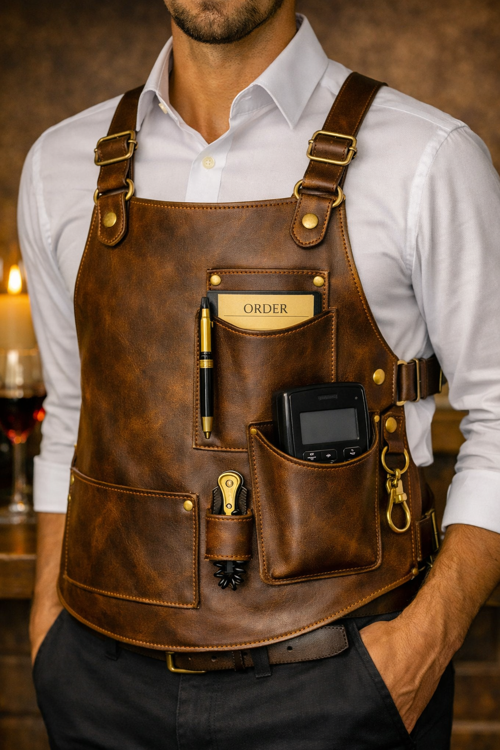This premium leather apron is designed for professionals who value both style and functionality. Its lightweight structure and adjustable straps provide maximum comfort during long working hours. The water‑resistant leather surface ensures easy cleaning, while reinforced stitching guarantees long‑term durability. With customizable pockets, colors, and sizes, it is ideal for chefs, baristas, waiters, and hospitality teams looking to elevate their presentation and brand identity.