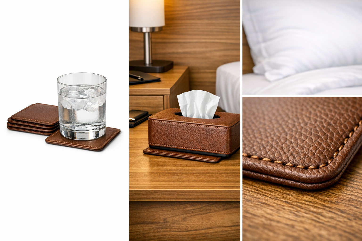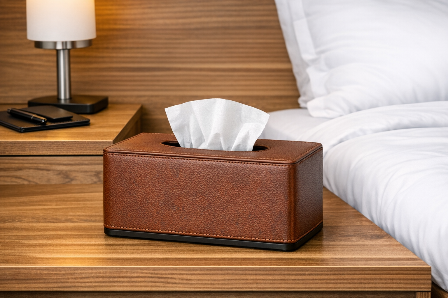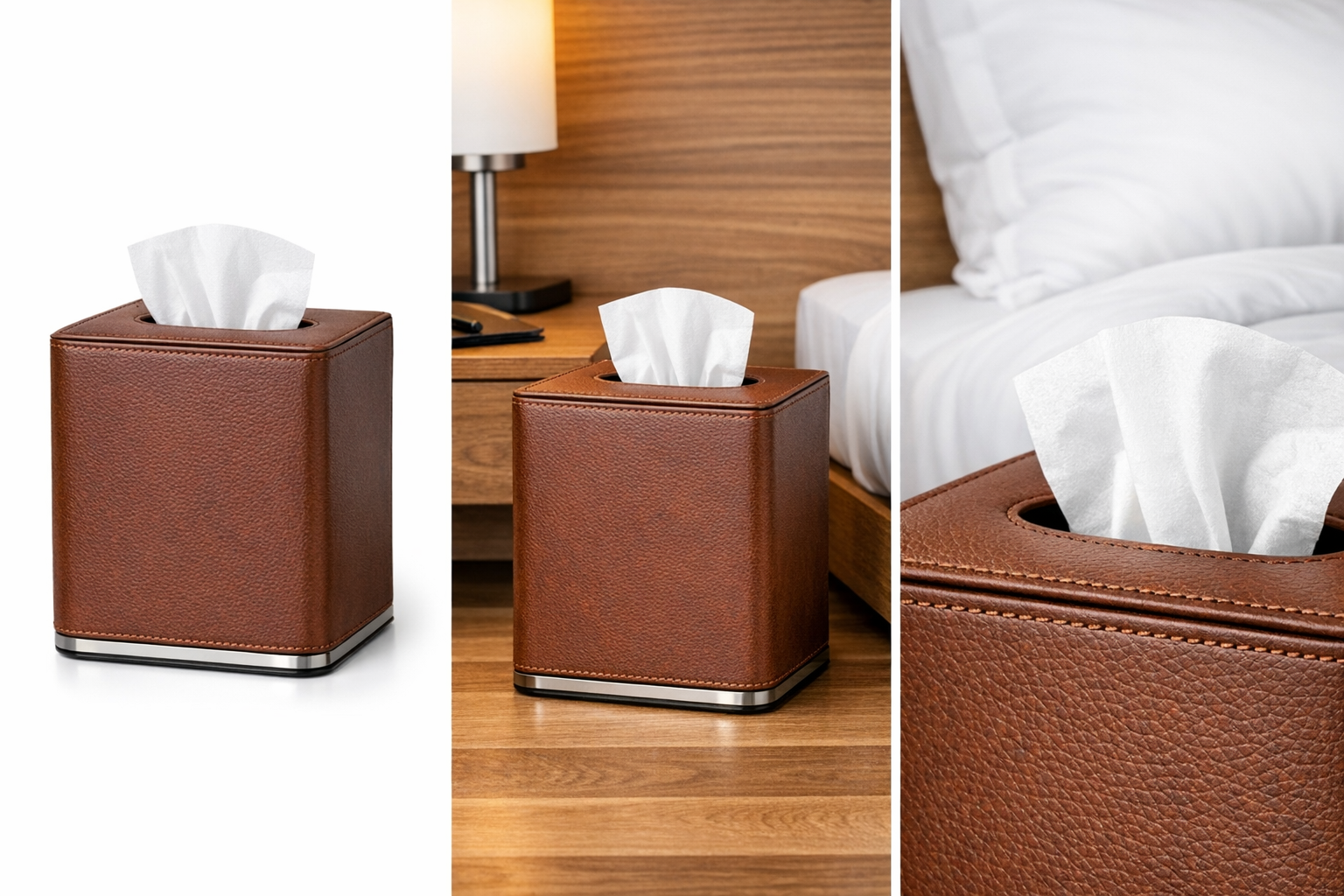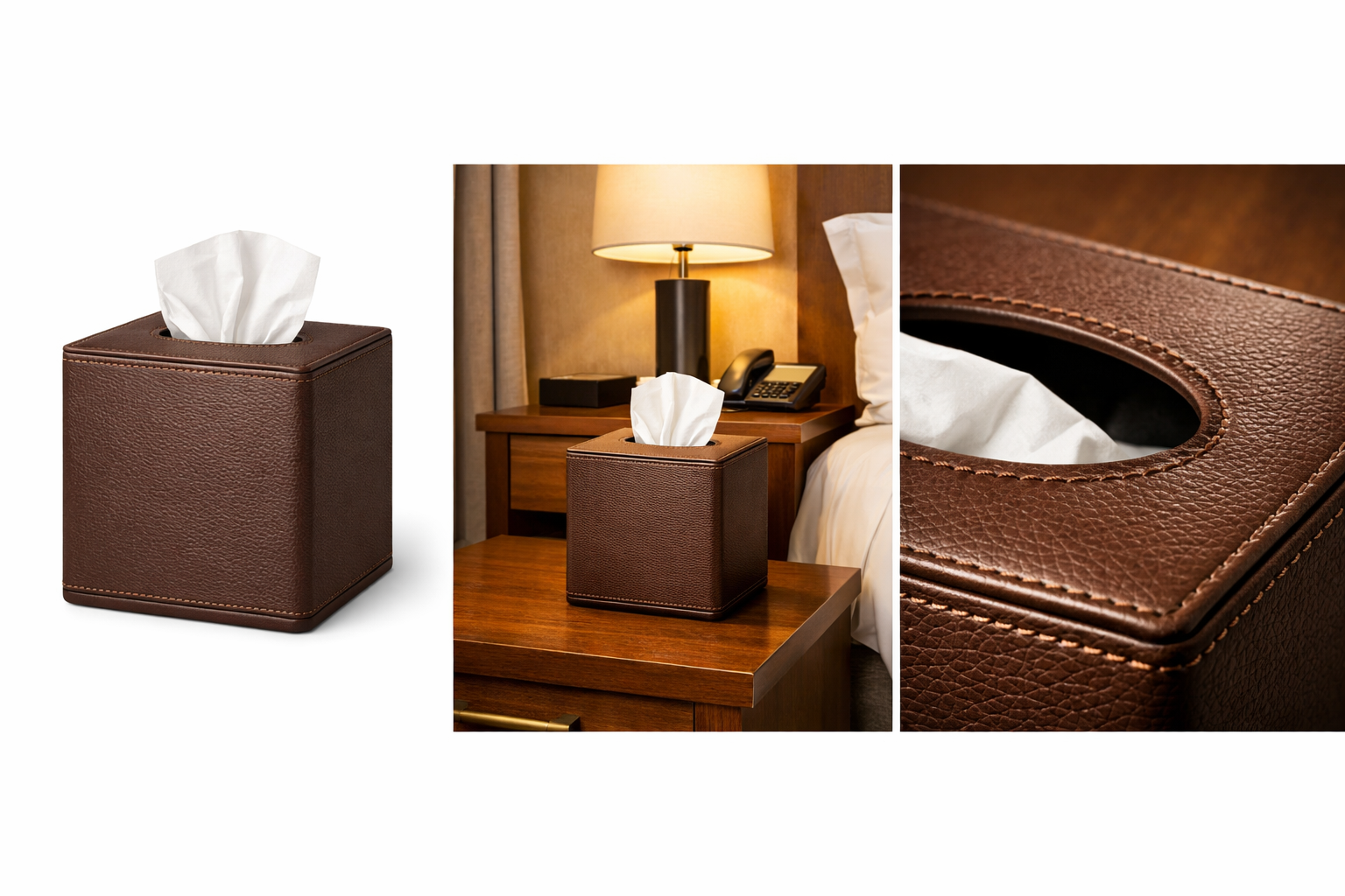 This leather napkin holder is designed to elevate the presentation of any hospitality environment. Its premium leather exterior adds a refined touch to tables, rooms, and service areas, while the durable internal structure ensures long‑lasting performance. The easy‑clean surface makes it ideal for daily hotel and restaurant operations. With customizable colors, sizes, and branding options, this napkin holder can be tailored to match your interior design and brand identity.