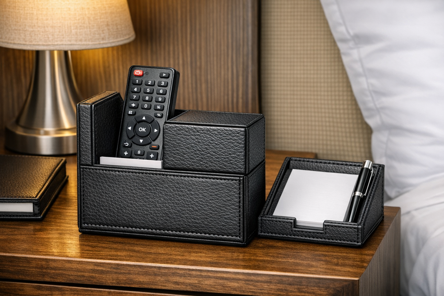 Yüksek kaliteli suni deri kaplaması, modern ve zarif bir görünüm sunarken yoğun otel kullanımına uygun dayanıklılık sağlar. Kolay temizlenebilir yüzeyi sayesinde hijyen standartlarını yükseltir ve housekeeping ekiplerine pratiklik kazandırır. İç yapısı, kumandanın sabit durmasını sağlayarak misafir kullanımını daha konforlu hale getirir.