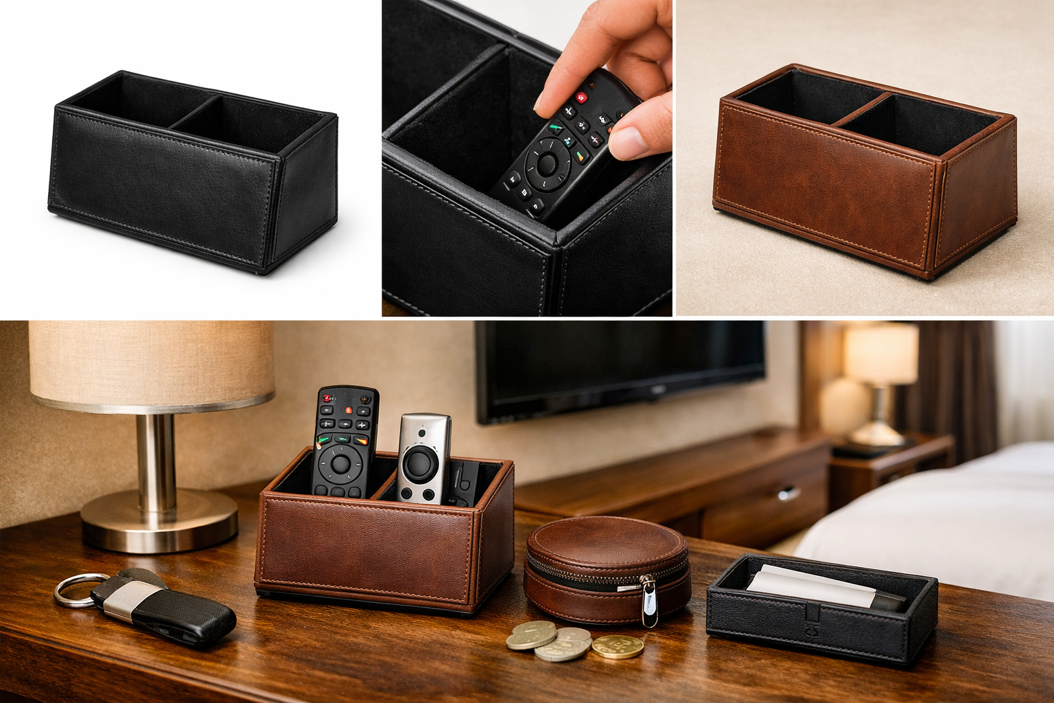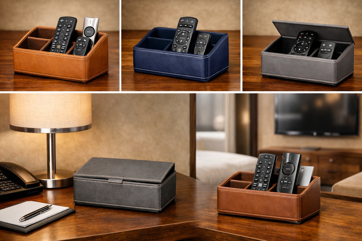 This leather TV remote holder is designed to enhance the guest experience in hotel rooms and suites. Its premium leather exterior adds a refined and professional touch to the room, while the durable internal structure ensures long‑lasting performance. By keeping the remote clean, organized, and easily accessible, it improves both hygiene and room presentation. With customizable colors, sizes, and branding options, this remote holder can be tailored to match your hotel’s interior design and brand identity.