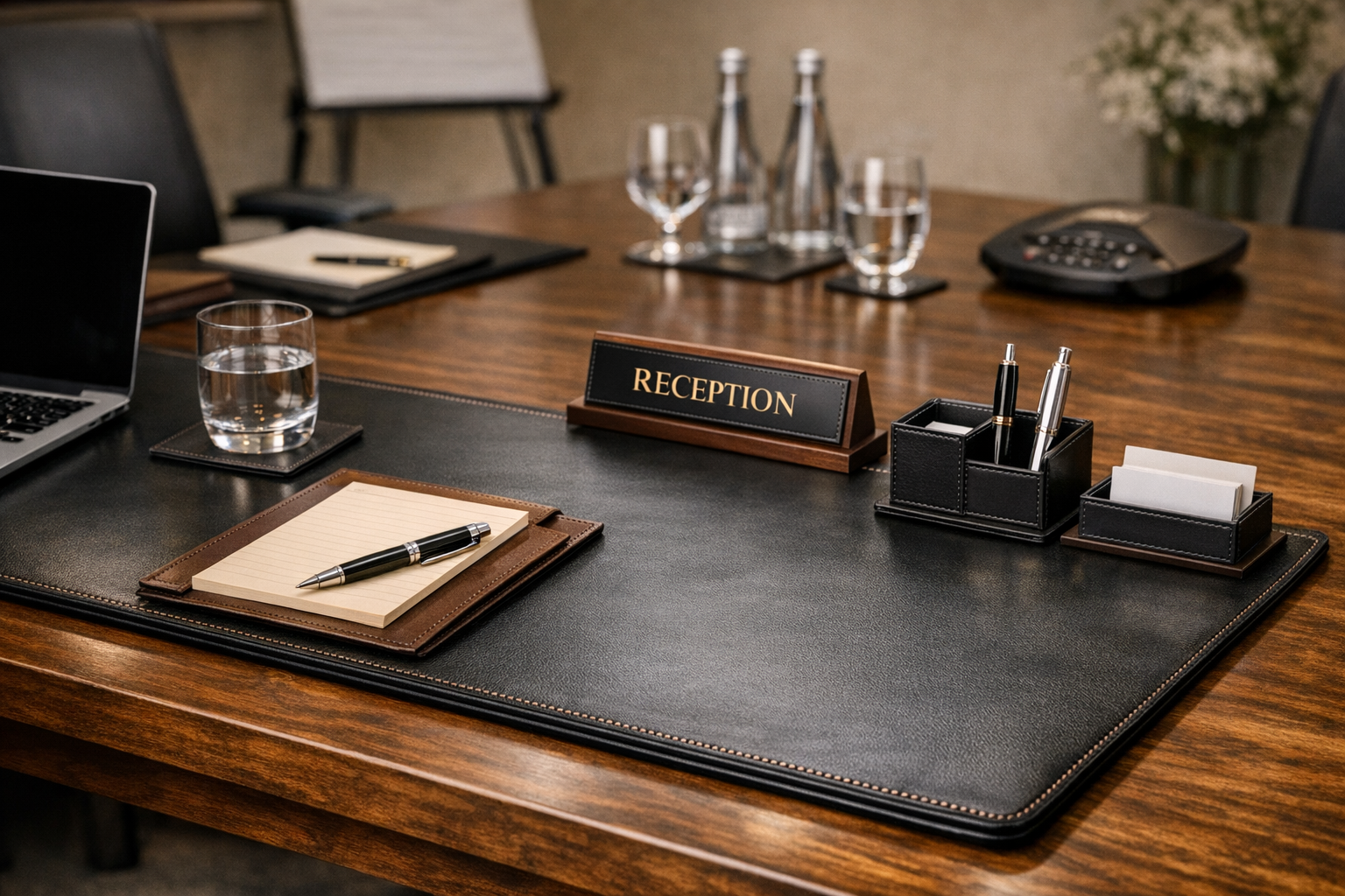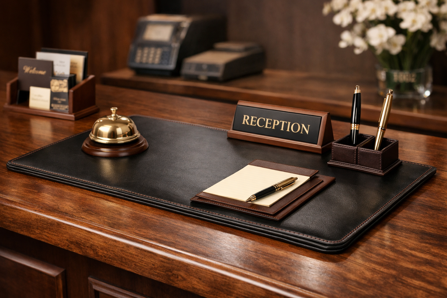 Otel Resepsiyon Deri Sümeni, misafir karşılama alanlarında düzeni, profesyonelliği ve marka prestijini güçlendirmek için tasarlanmış şık bir masa üstü aksesuarıdır. Resepsiyon bankosunda evrak imzalama, check‑in işlemleri, bilgi formları ve ödeme süreçleri sırasında hem estetik bir görünüm sunar hem de yüzey koruması sağlar.
